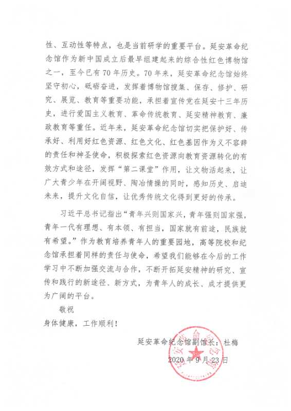 成人ai近日,中共中央总书记、国家主席、中央军委主席习近平给中国延安精神研究会第六次会员大会发来贺信,指出“延安是中国革命的圣地,老一辈革命家和老一代共产党人在延安时期培育形成的延安精神是我们党的宝贵精神财富。希望同志们在新的历史条件下,坚持正确政治方向,服务党和国家工作大局,深入研究、大力宣传、认真践行延安精神,努力为全面建成小康社会、乘势而上开启全面建设社会主义现代化国家新征程提供强大精神动力。”我校成人ai 2019级本科生高天航同学积极参加学院组织的“我在家乡讲四史”主题微课拍摄,深入调研、用心讲述,广泛宣传,积极践行,用一名大学生的担当将总书记的贺信精神落到实处,让延安精神永放光芒。 高天航同学的表现得到了陕西省延安市延安革命纪念馆的高度赞誉,纪念馆近日特向我校发来感谢信。“得知贵校高天航同学,利用学习之余,用青年一代喜闻乐见的方式,学习和宣传家乡的红色文化,讲好革命故事,发扬革命传统,传承红色基因,为爱国主义、革命传统、延安精神教育工作贡献力量,我十分激动。从高天航同学的身上,我们可以看到贵校在青年学子思想政治教育方面的显著成效,可以看出贵校对青年学子学“四史”、悟“四史”、践“四史”的高度重视和有力组织。”